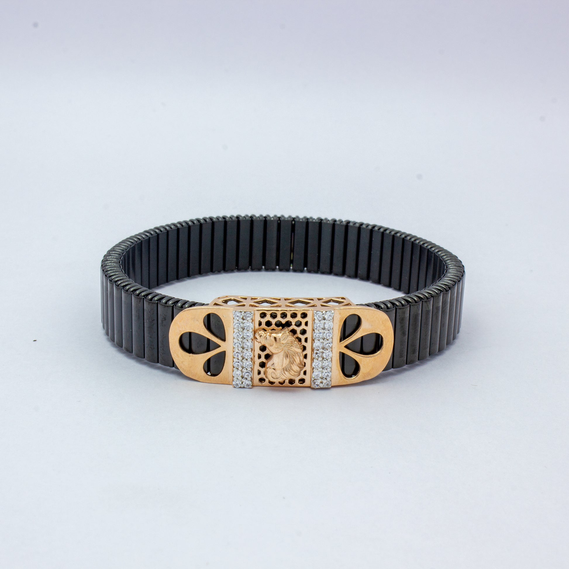This bracelet showcases a 925 silver floral lion centerpiece with diamond-studded accents, paired with a sleek black band for a regal, modern look.